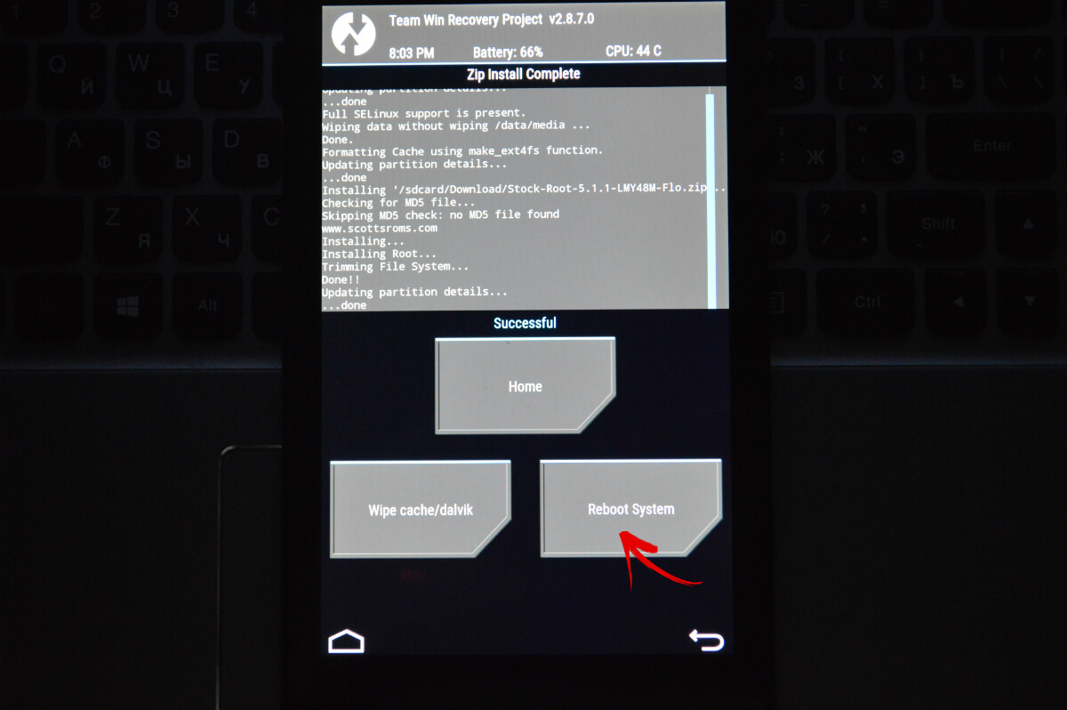 10. В конце появится сообщение об удачном завершении прошивки. Нажмите на «Reboot System», чтобы загрузить Android.