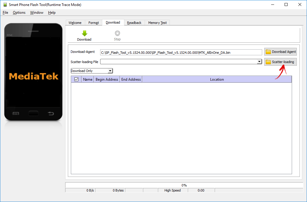 3. В поле «Download-agent» уже будет указан путь к «MTK_AllInOne_DA.bin». Далее нужно нажать «Scatter-loading» и выбрать scatter файл в папке с прошивкой.
