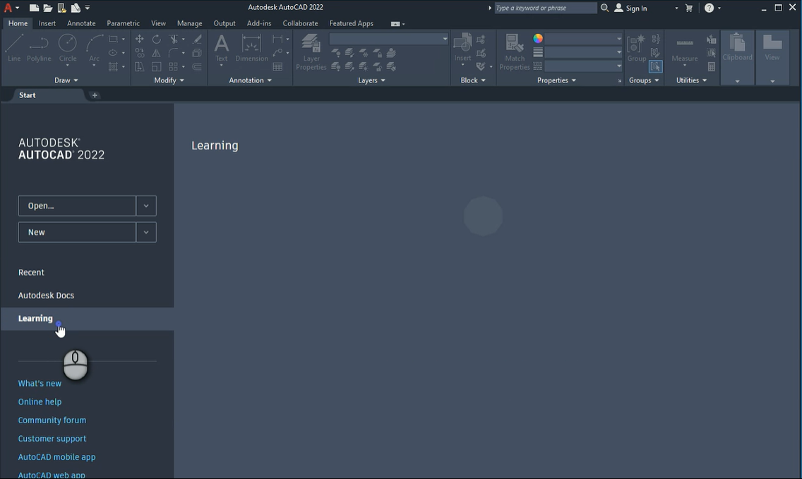 Компания Autodesk предлагает пользователям обширные возможности для изучения собственного программного обеспечения. В программе 2022 года перейти к обучению Автокаду для начинающих лучше прямо из основного окна, нажав на кнопку Обучение (для этого требуется интернет-подключение).