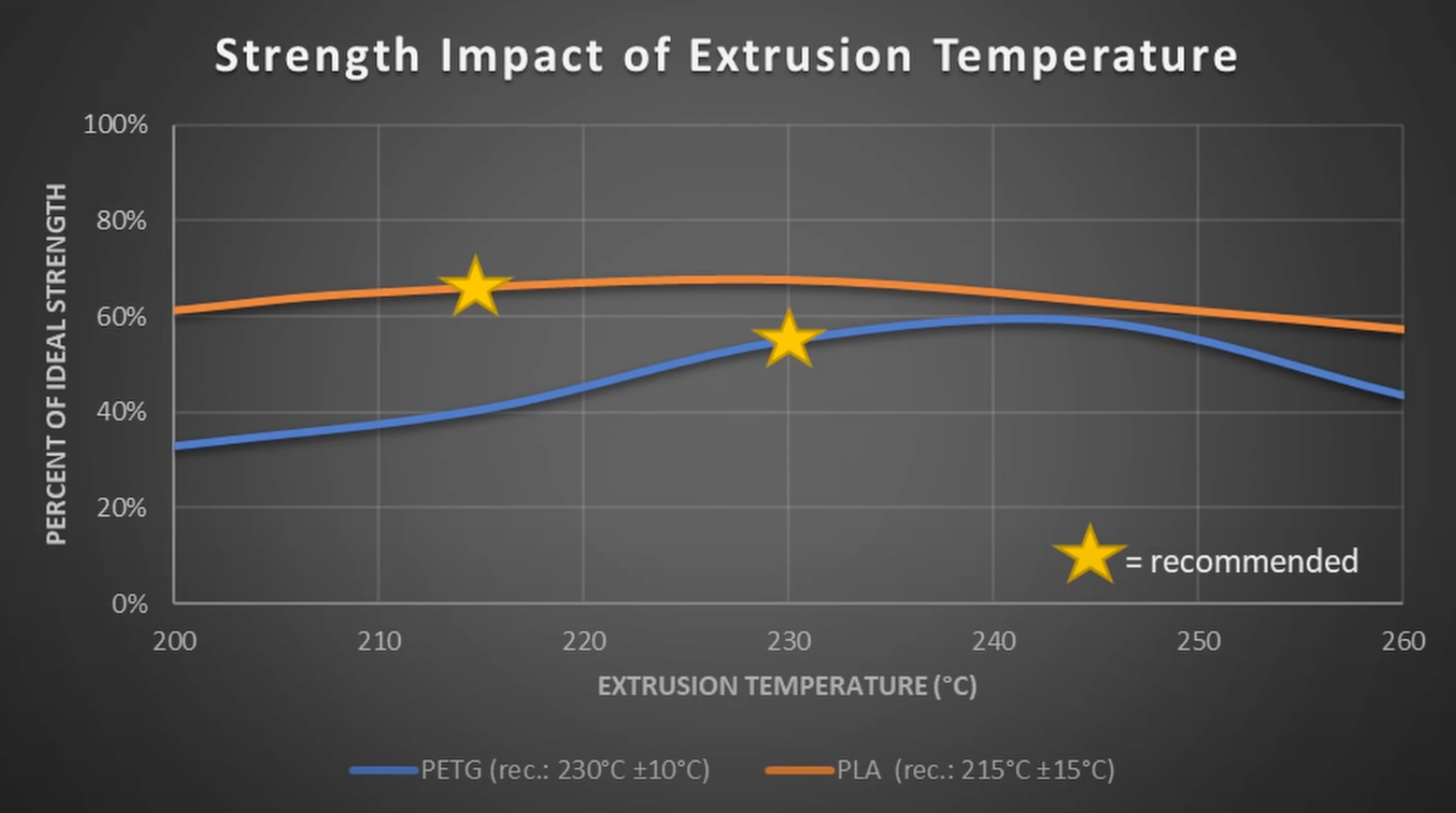 Согласно общим представлениям о том, как слои спекаются между собой, образуя цельную модель, чем выше температура печати, тем больше будет предел прочности на разрыв поперёк слоёв. Тем не менее, по тестам на PLA и PETG, прочность растёт только до определенной температуры, а потом начинает падать. Этот эффект не связан с какой-то деградацией материала из-за слишком высокой температуры и пока не имеет какого-то простого и непротиворечивого объяснения. Поэтому логично для этих двух материалов использовать температуры печати около 210°С для PLA и 235°С для PETG.