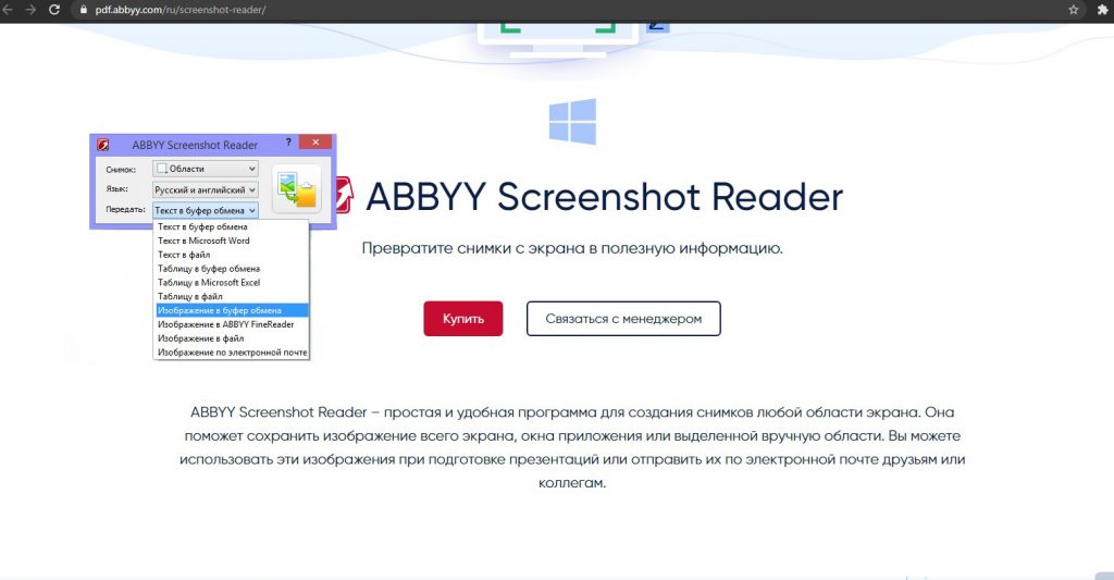 Работает Screenshot Reader в двух режимах – создании скриншотов и распознавании текста с экрана. Если вам нужно второе, сначала просто нажимаете на комбинацию клавиш, выбираете язык и принцип захвата, выделяете область, подтверждаете действие и ждете несколько секунд. Полученные данные сохранятся в выбранном вами формате. В приложение встроен словарь и переводчик, также другие полезные функции от компании ABBYY.