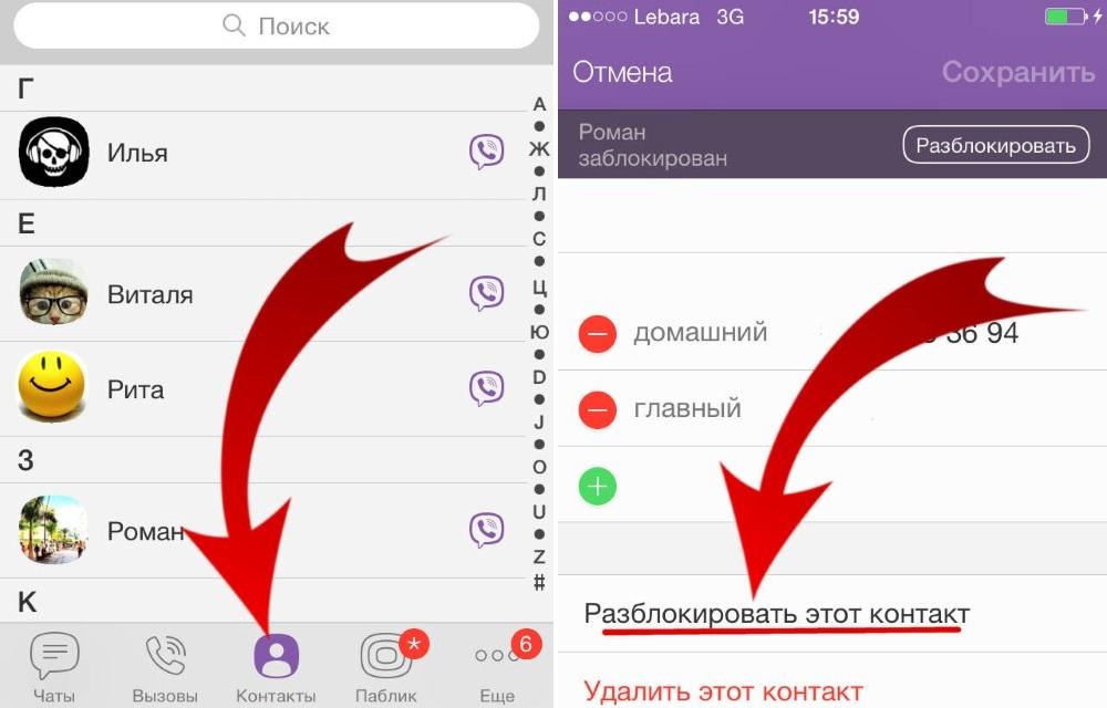 Разблокировка контакта в Вайбере на телефоне