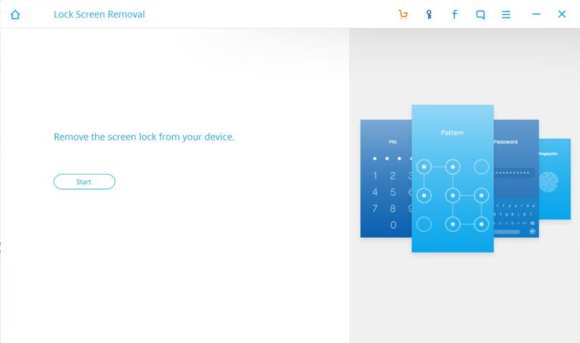 Запустите программное обеспечение на своем компьютере и выберите «Блокировка экрана». Затем используйте USB-кабель для подключения телефона Samsung к компьютеру. На этом этапе интерфейс программы, как показано ниже, нажмите «Пуск».