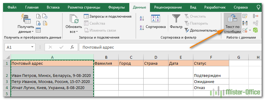 Чтобы воспользоваться функцией «Текст в столбцы», выполните следующие шаги: