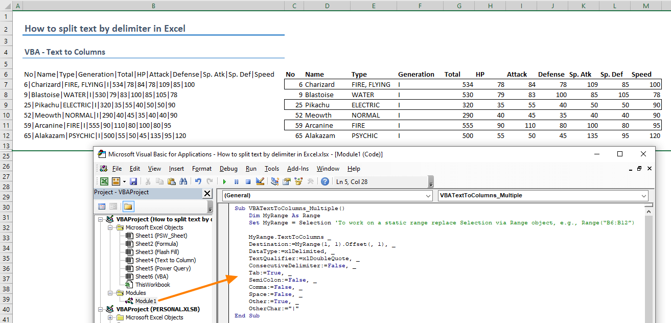 Следующий код позволяет разделить данные из выбранных ячеек на соседние столбцы. Обратите внимание, что каждый поддерживаемый разделитель указан в качестве аргумента, который вы можете включить или отключить, присвоив ему значение True или False. Вкратце, True означает, что вы хотите установить этот аргумент в качестве разделителя, а False означает игнорировать этот символ
