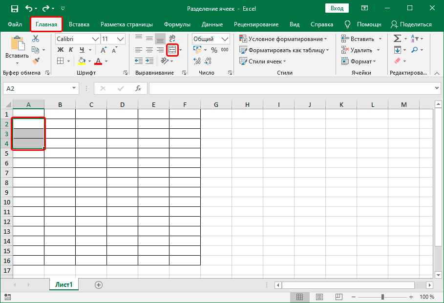 Действия для “деления” ячейки на несколько строк аналогичны, правда, в этом случае объединение для каждого столбца придется делать вручную.
