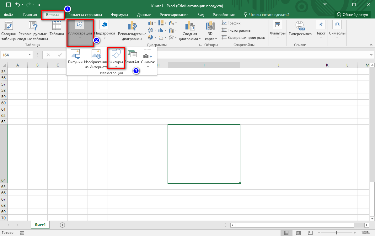 - Выделяем одну ячейку, в которую необходимо вставить разделитель, затем перемещаемся во вкладку «Вставка», затем находим раздел «Иллюстрации», в нем жмем по дополнению «Фигуры».