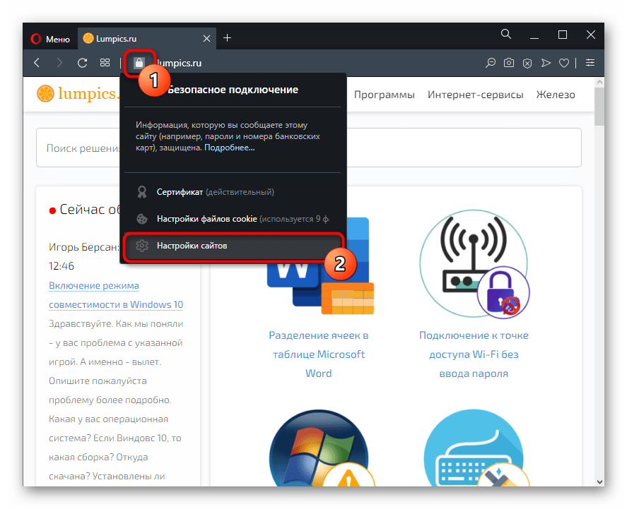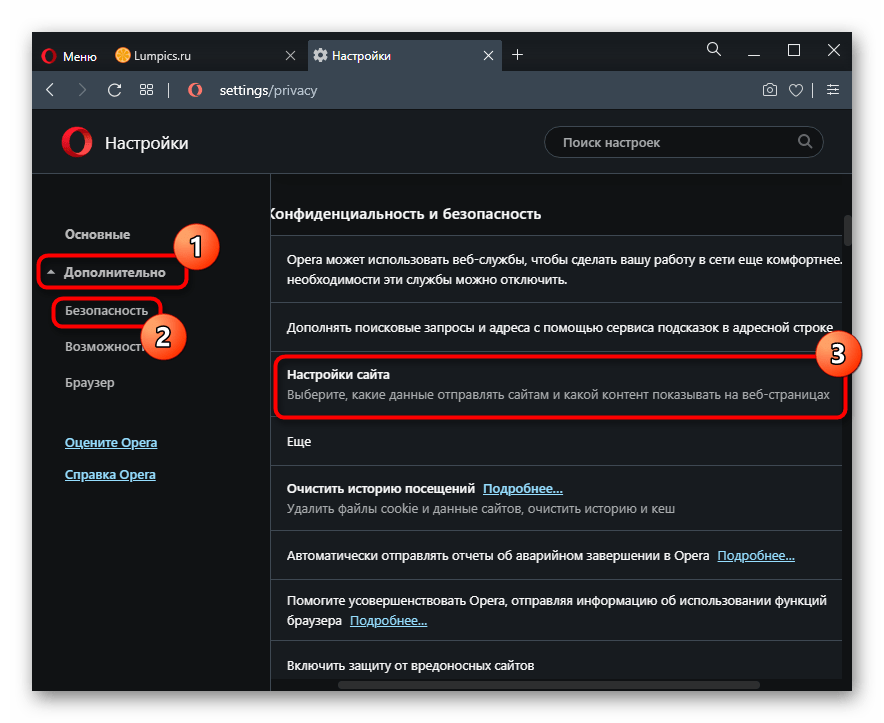 Opera во многом схожа с предыдущим браузером по своей настраиваемости, так как у обеих программ одинаковый движок. По этой причине мы не будем повторно составлять ту же самую инструкцию — ознакомьтесь со Способами 1 и 2 про Google Chrome, воспользовавшись одним из них для конкретного сайта.
