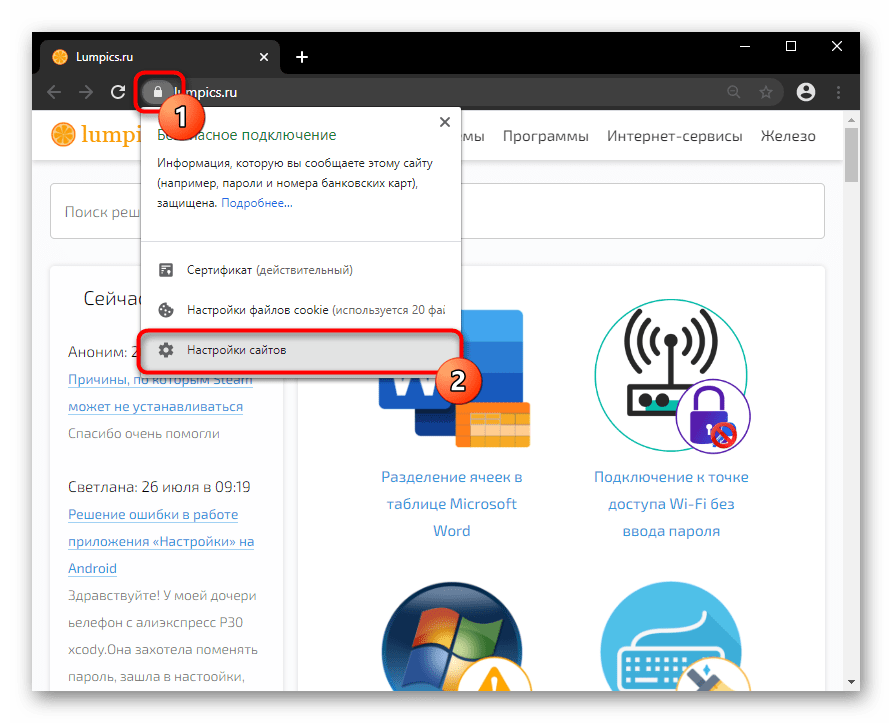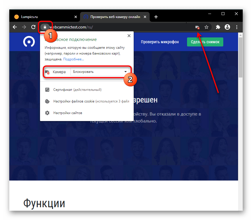 Метод 2. Разрешение доступа к камере и микрофону для одного сайта