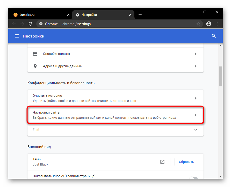 В блоке «Конфиденциальность и безопасность» вам нужен пункт «Настройки сайта».