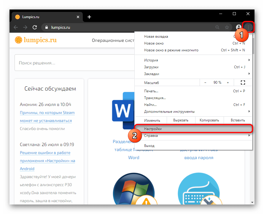 - Фирменной кнопкой разверните «Меню» и выберите «Настройки».