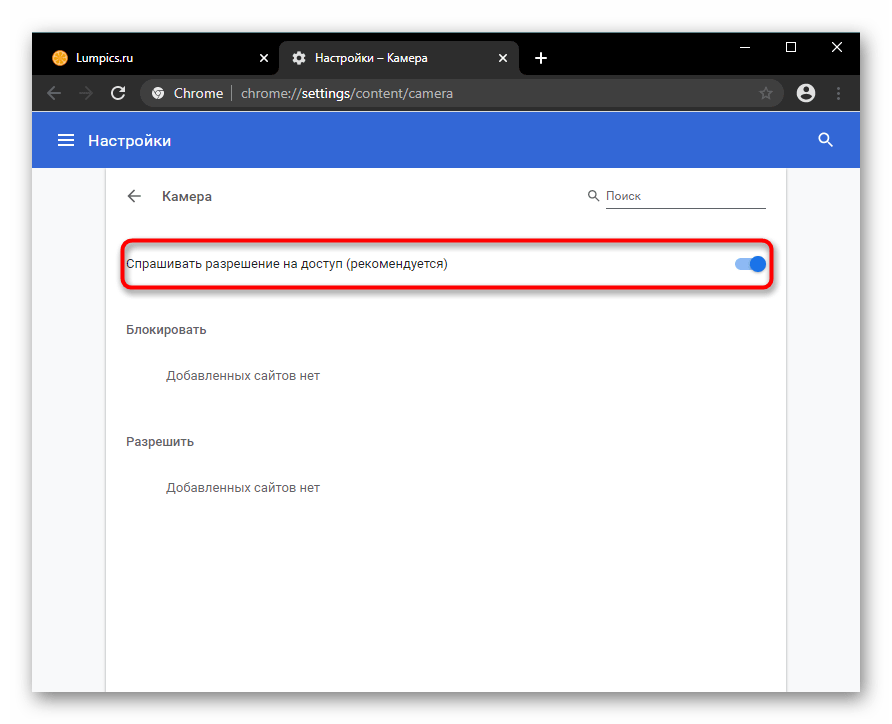 Когда в настройках браузера запрещено использование камеры, действиями из предыдущих способов пользователь разрешит ее работу лишь одному URL. Задать глобальное значение для этой настройки можно лишь в настройках.