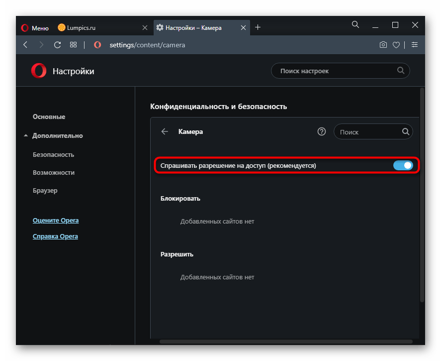 Переведите состояние единственного доступного пункта в активное. Теперь все сайты будут спрашивать разрешение на использование вебки. А вот параметра, разрешающего ее включение без дополнительных подтверждений со стороны юзера, здесь нет в целях безопасности. Ниже, кстати, могут располагаться адреса, для которых вы вручную запрещали или разрешали работу вебки.