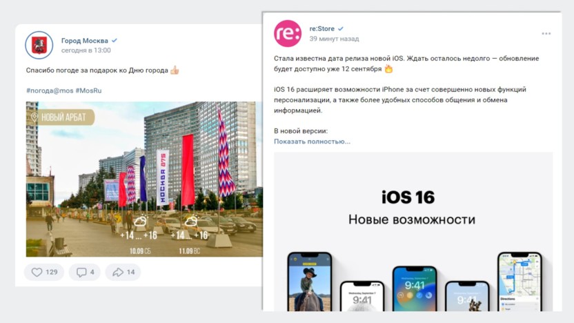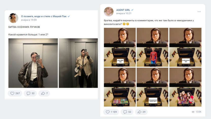 Вовлекающий контент. Публикации, которые прямо или косвенно призывают читателей к действию: отреагировать, репостнуть или оставить комментарий. Например, на личной странице можно попросить поделиться мнением, а на коммерческой – предложить сделать выбор между двумя позициями или пунктами. Цель вовлекающего контента – повысить активность, чтобы получить еще больше лайков и комментариев, так как такой контент будет чаще попадаться подписчикам в рекомендательной ленте ВКонтакте.