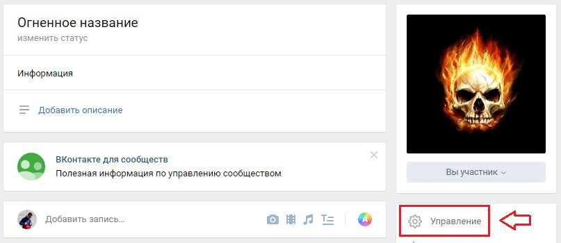 Чтобы продолжить настройку группы, нажимаем на «Управление» прямо под только что установленным аватаром.