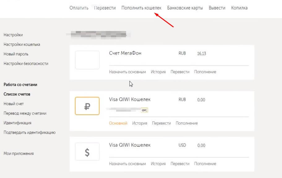 - Зайдите в личный кабинет на официальном сайте QIWI кошелька или авторизоваться в мобильном приложении.