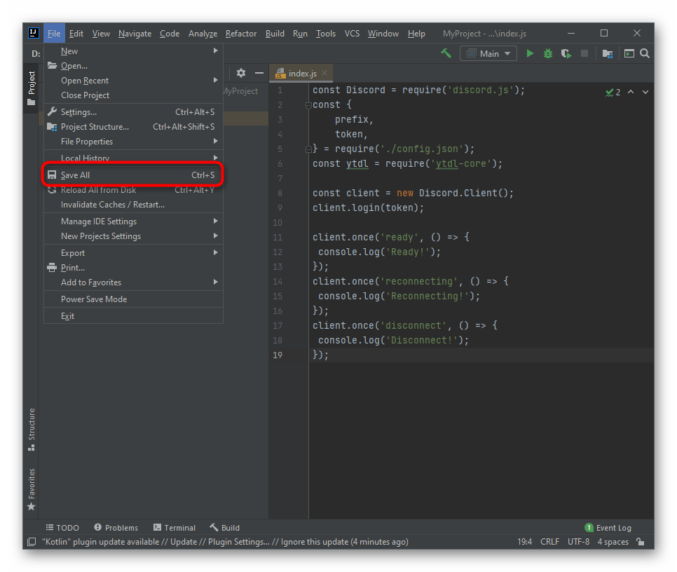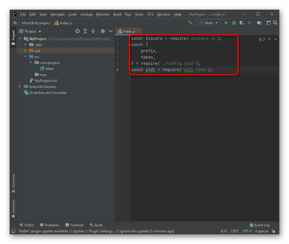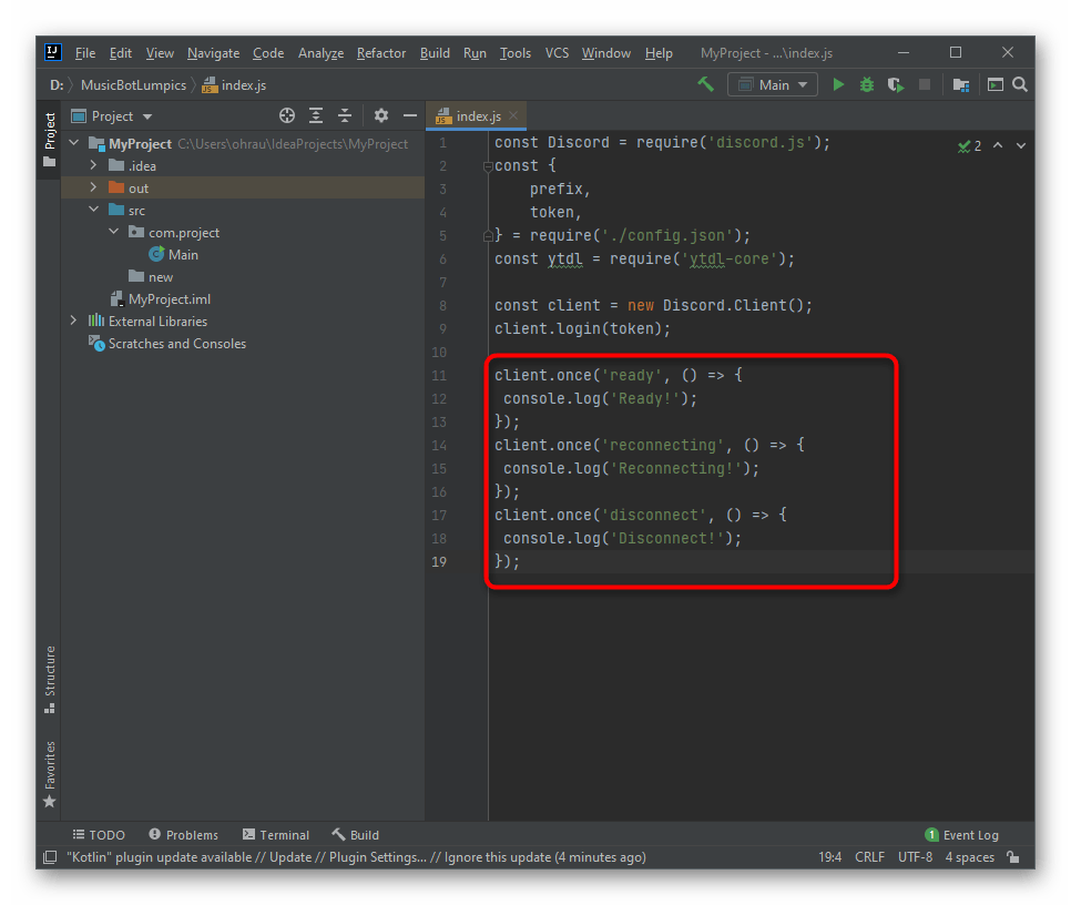 Сначала нам нужно убедиться в том, что бот вообще запускается на сервере и переходит в онлайн-режим, для этого понадобится записать его основную часть кода в , а затем уже использовать Node.js для запуска.