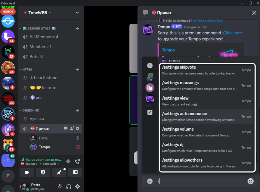 Подводя итоги, отмечу, что Tempo Bot показался мне довольно удобным и продвинутым ботом для музыки. Только с ним не возникло никаких проблем с настройками, их даже не пришлось менять, чтобы сразу воспроизвести треки. Минусами же этого бота можно считать наличие некоторых платных функций и отсутствие поддержки YouTube.