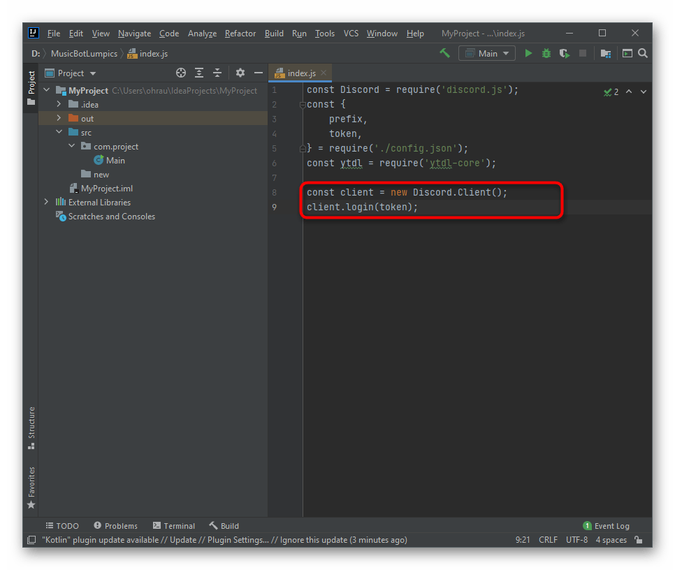 После установки библиотеки необходимо подключиться к серверу Discord и создать экземпляр клиента: