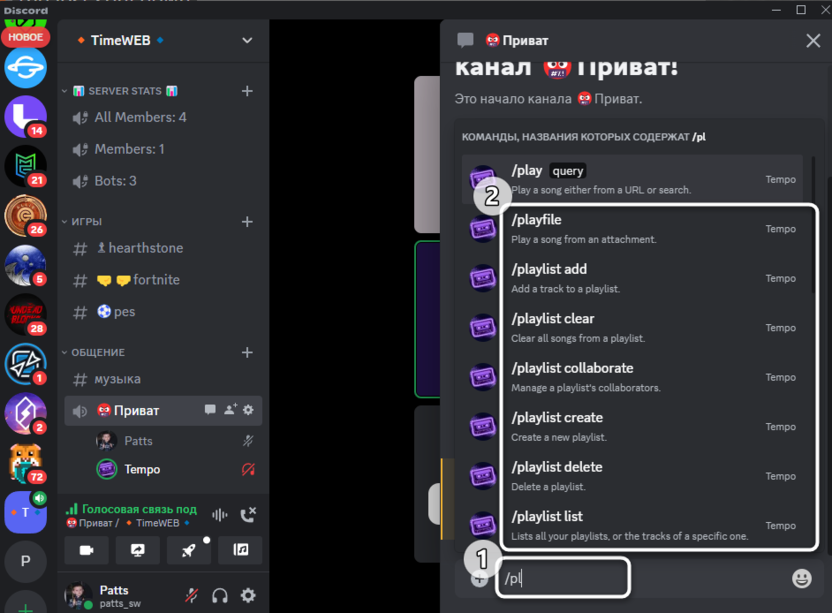 Рекомендую ознакомиться и с другими командами, которые могут пригодиться во время воспроизведения музыки и управления плейлистами. Если вы введете сначала просто /play, то в списке команд отобразится весь перечень подходящих вариантов работы с плейлистами и добавлением треков в очередь. Можно воспроизвести музыку из файла, создать новый плейлист, удалить существующий и вывести полный список созданных плейлистов. Кстати, потратив немного времени на формирование нескольких плейлистов с треками, вы можете обеспечить воспроизведение музыки на своем сервере практически 24/7 и только иногда заходить проверять работу бота на специально выделенном для него канале.