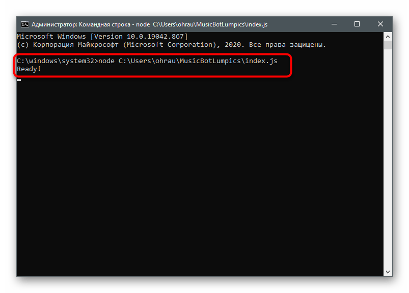 Об успешном запуске бота свидетельствует появившаяся надпись «Ready!».