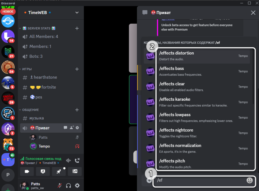 При наборе /effects появляется список всех доступных эффектов. Можно добавить дисторшн, увеличить бас, ускорить воспроизведение, поднять тон и нормализовать громкость. Есть и команда для удаления всех наложенных эффектов, которая выглядит как /effects clear. Еще раз упомяну, что работа со всеми этими командами доступна только в том случае, если вы приобрели Tempo Bot Premium.