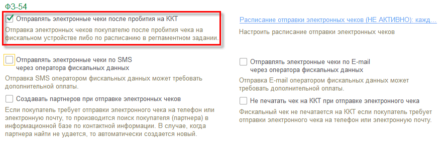 - поставить галочку «Отправлять электронные чеки после пробития на ККТ».