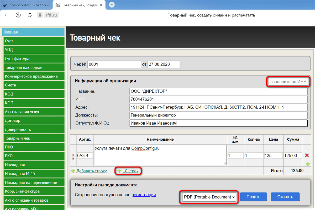 Также вы можете воспользоваться специальными сервисами, которые позволяют напечатать чек на принтере онлайн. Для этой цели вам не нужно скачивать специальный чековый шаблон для Microsoft Word. Все что вам нужно – это открыть один из таких веб-сервисов, заполнить все необходимые поля для будущего кассового чека и нажать на «Печать».