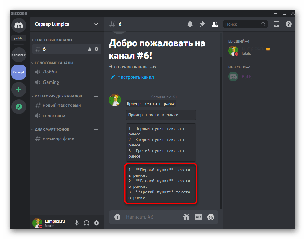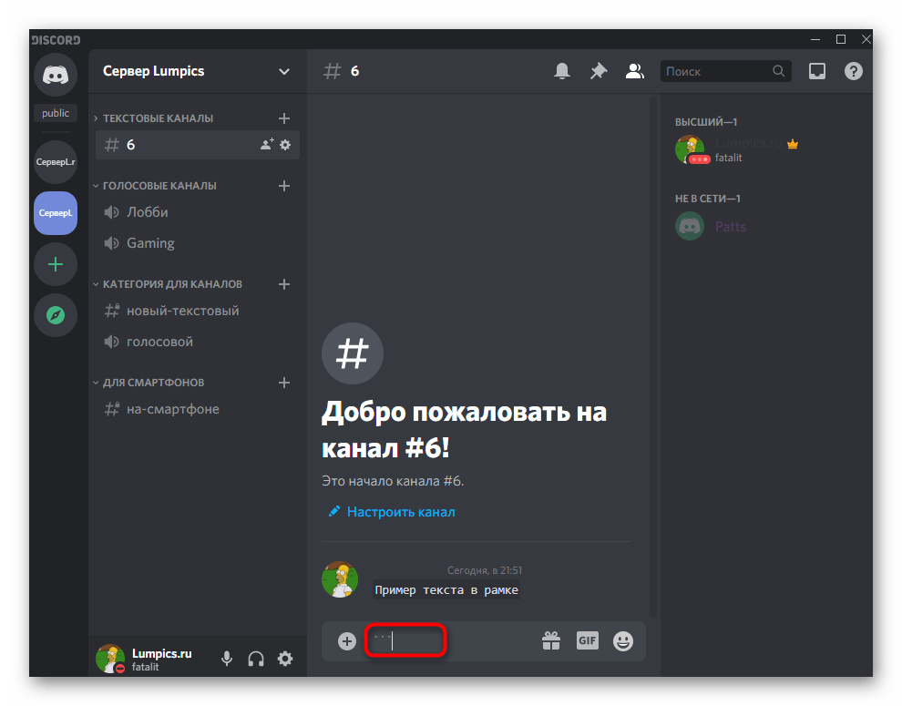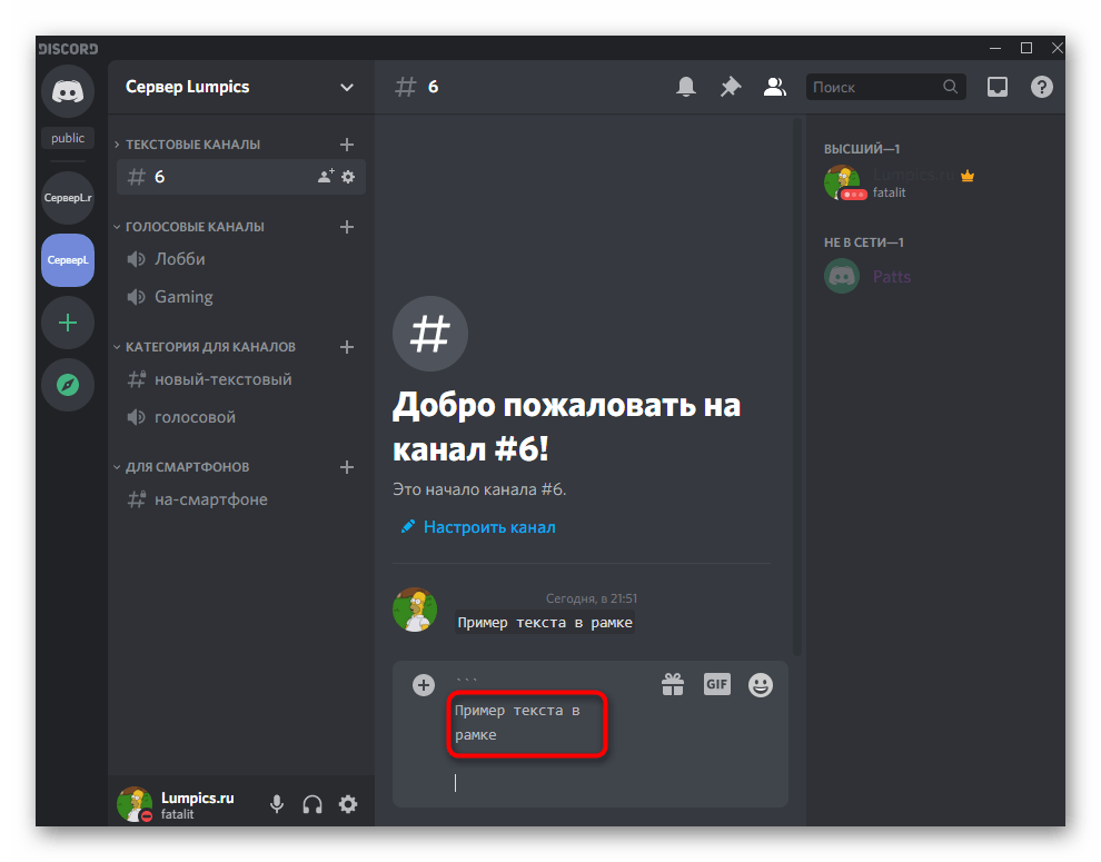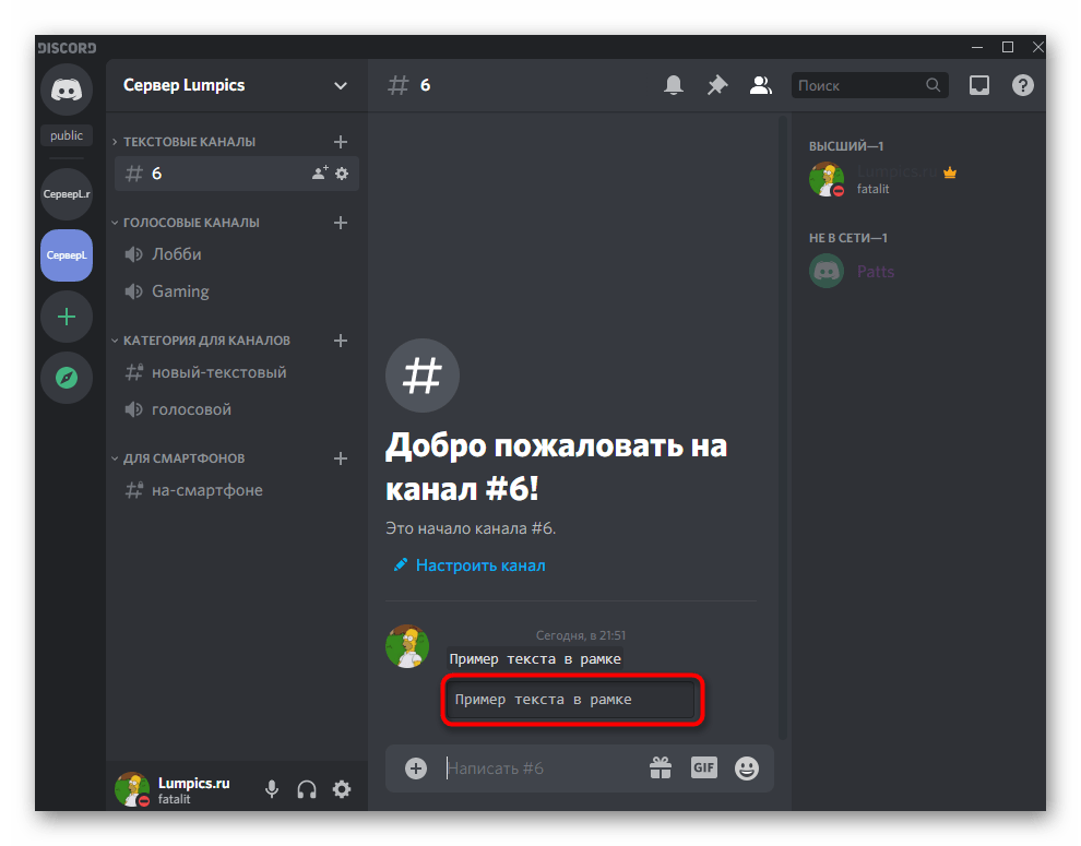 Сначала поговорим о том, как сделать сообщение в рамке в Дискорде – оно будет выделено черным фоном. Просто воспользуйтесь следующими символами: