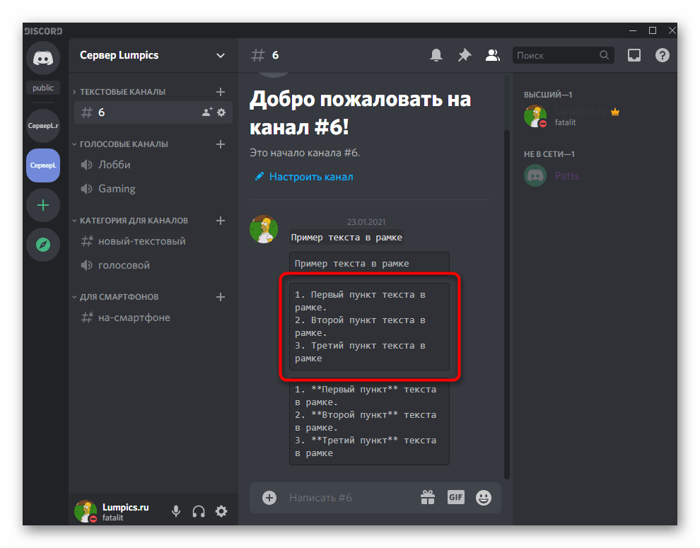Добавление полноценной рамки, которая значительно выделяет фрагмент или целое сообщение в чате, идеально подойдет, когда требуется указать акцент на самом тексте или же вы оформляете внутренние правила либо другую важную информацию на канале сервера.
