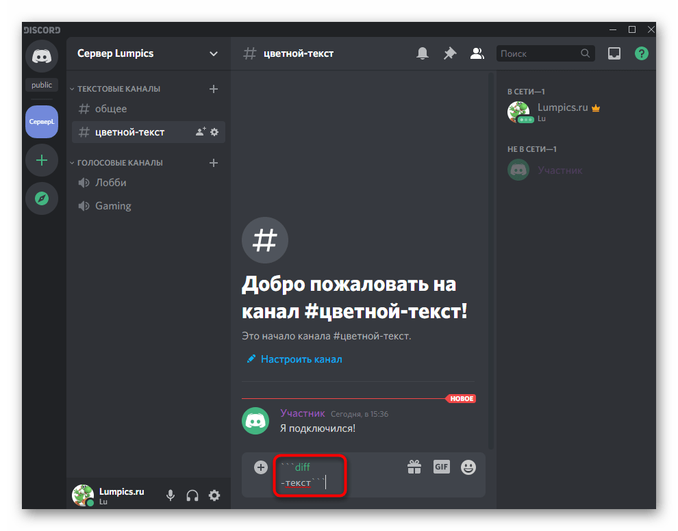 Здесь помогут коды для Дискорда. Каждое цветовое решение имеет собственное обозначение. Эти символы нужно вписать сразу после первых открывающихся кавычек – тогда месседж окрасится в нужный оттенок.