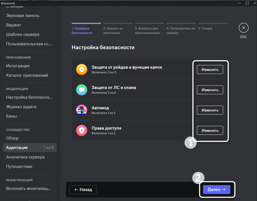 В первую очередь на экране отобразится несколько настроек безопасности, входящих в состав сообщества. При ручном переходе вы уже могли ознакомиться с ним и самостоятельно включить какие-то из настроек. Однако дополнительно нажмите «Изменить» возле каждого пункта и ознакомьтесь с тем, какие варианты защиты предлагает непосредственно инструмент адаптации.