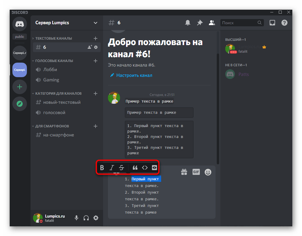 Доступно несколько видов форматирования текста Discord через Markdown. Рядом с названием стиля вы увидите символы, которые необходимо поставить с двух сторон от вводимого текста. Кавычки и пробелы не требуются!