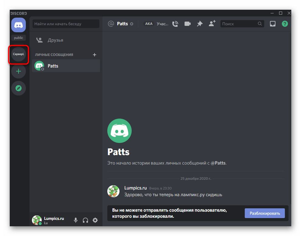 - Создайте сервер, если это еще не сделано. Для этого щелкните значок плюса в левом круге, нажмите кнопку «Создать сервер», введите его имя и нажмите «Создать.