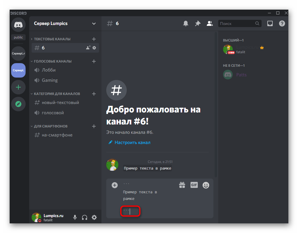 Еще раз сделайте отступ на следующую строчку и снова добавьте «` . Если вы будете нажимать Enter до закрывающего кода «` , сообщение не отправится, а только произойдет переход на строку ниже.