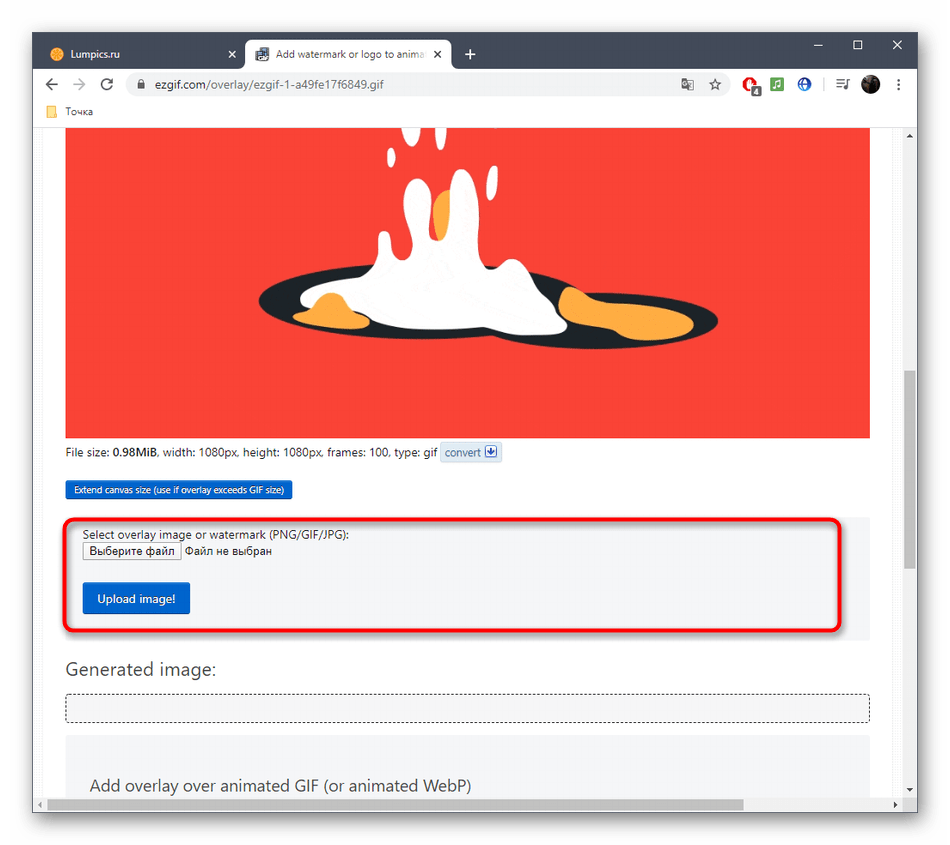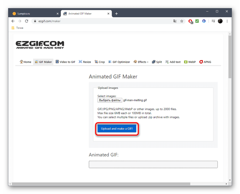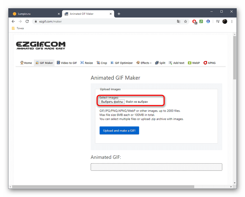 - Откройте веб-сайт. В верхней части у пользователя запрашиваются фотографии, которые будут использованы в кадрах анимации. Загрузите их, нажав на блок, выделенный красной рамкой, либо перетащив изображения туда.