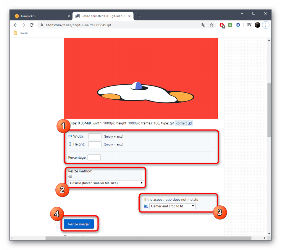 - В настройках определите разрешение будущей гифки, можно поставить флажок на пункте “пропорции” для того, чтобы существовала пропорциональность, то есть при изменении ширины автоматически подгонялась высота.