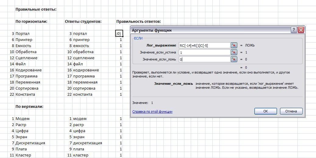 Теперь можно сравнить правильный ответ с ответом ученика. Для этого будем использовать функцию ЕСЛИ: если слова совпадут, напишем напротив ответа «1», если нет «0». Мы используем числовые значения, а не слова «верно» — «неверно», потому что в дальнейшем проще будет подсчитать количество правильно угаданных слов.