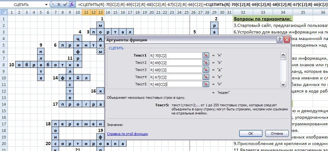 Было бы просто, если каждое слово кроссворда пользователь вводил в одну ячейку. Тогда бы мы просто связали ячейки в столбце «Введено» с соответствующими ячейками кроссворда. Но, как мы знаем, в каждую ячейку кроссворда вписывается не одно слово, а одна буква. Воспользуемся функцией «СЦЕПИТЬ», чтобы объединить эти буквы в одно слово.