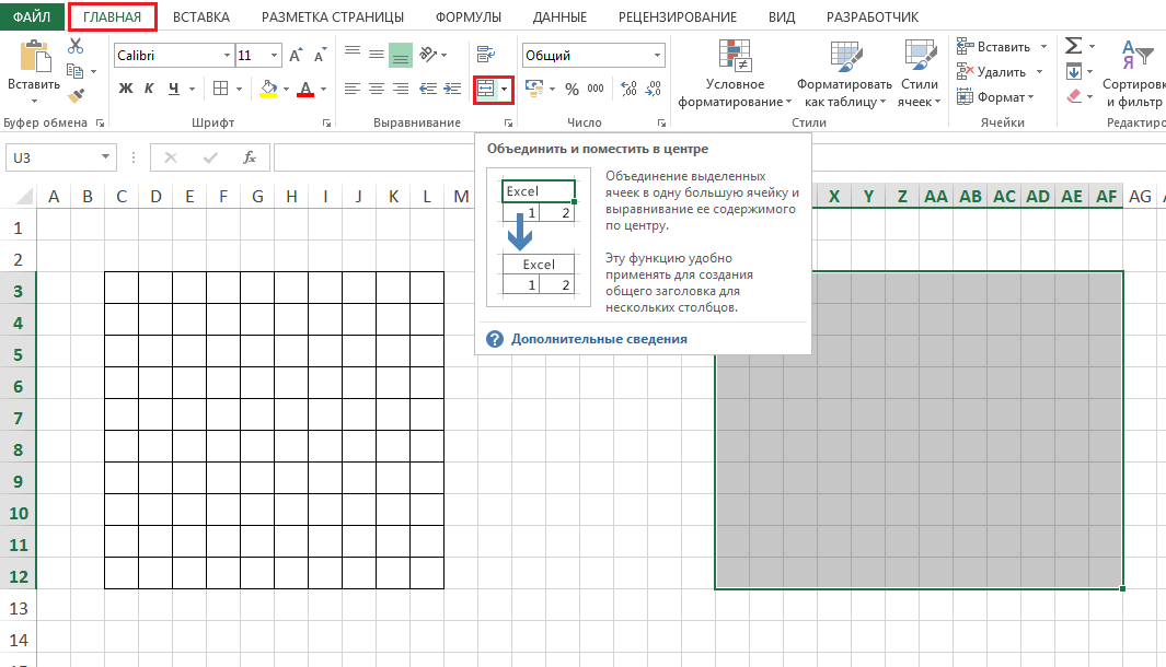 Справа от таблицы для ответов будем создавать поле для записи вопросов. Для этого выделяем диапазон и во вкладке «Главная» нажимаем на команду «Объединить и поместить в центре».
