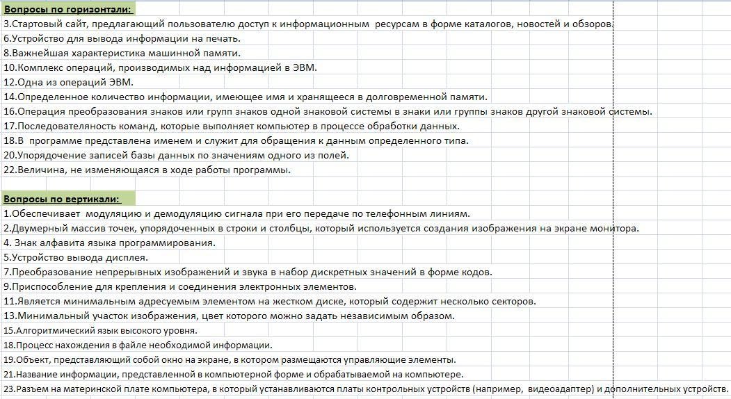 Кроссворд — это головоломка, в которой в клетках записываются только ответы. Вопросы указываются отдельно. Это главное отличие данной игры от сканвордов, где вопросы также прописываются в клетках с направлением для записи. Вопросы для кроссворда с решениями можно найти в интернете. Также можно придумать головоломку самостоятельно, если есть такая необходимость. В нашем примере используется небольшой вертикальный кроссворд, найденный в интернете.
