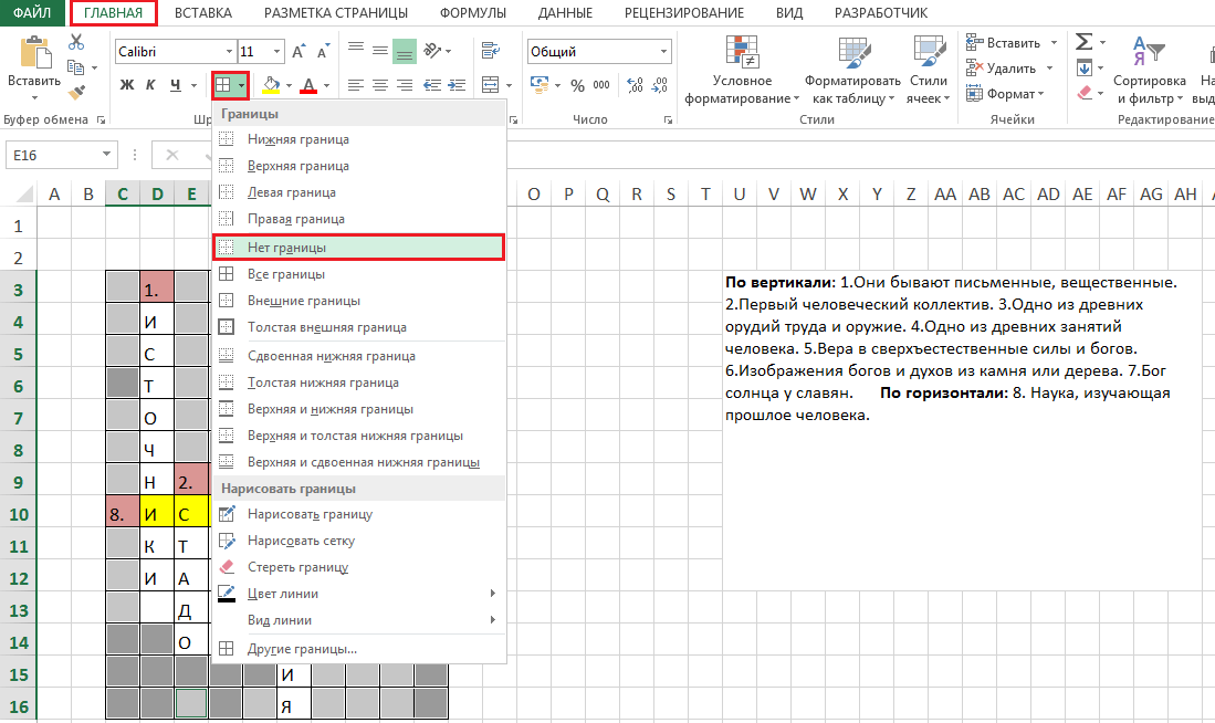 Следующий этап — очистка лишних клеток. Все ячейки, в которых нет букв или цифр, нужно сделать незаметными. Для этого достаточно убрать границы. Выделяем незаполненные клетки и в инструменте «Границы» на вкладке «Главная» выбираем пункт «Нет границ».