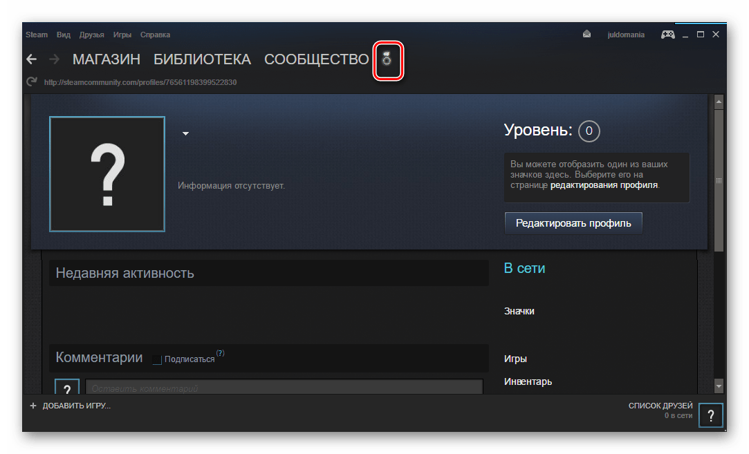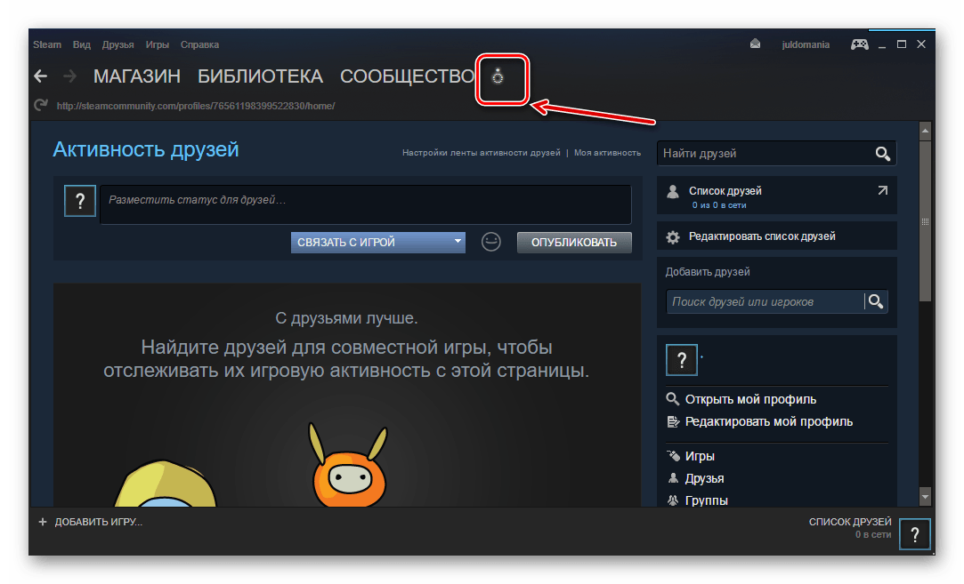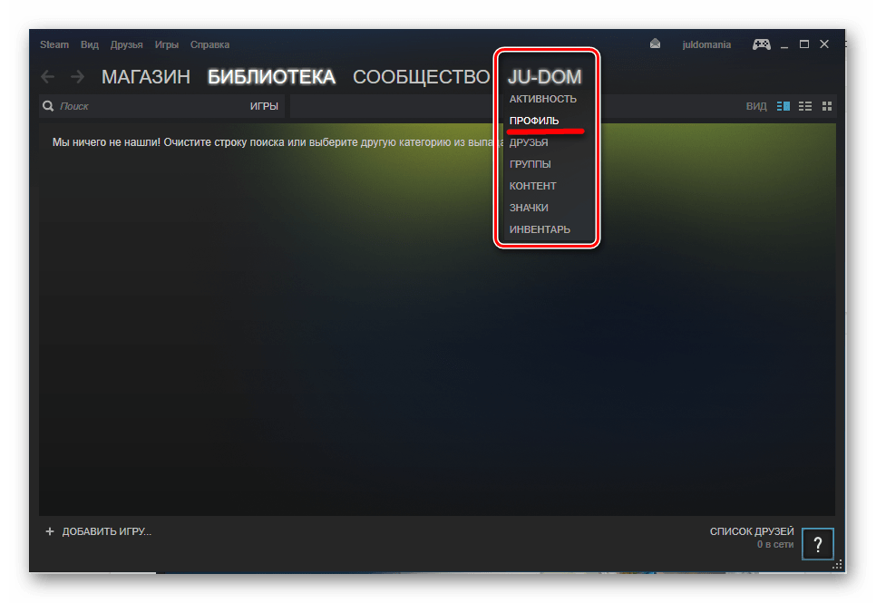 Запустив клиент Стим, обратите внимание на расположенную сверху панель управления. В ее условном конце найдите строку, в которой указано ваше текущее имя и кликните по нему.