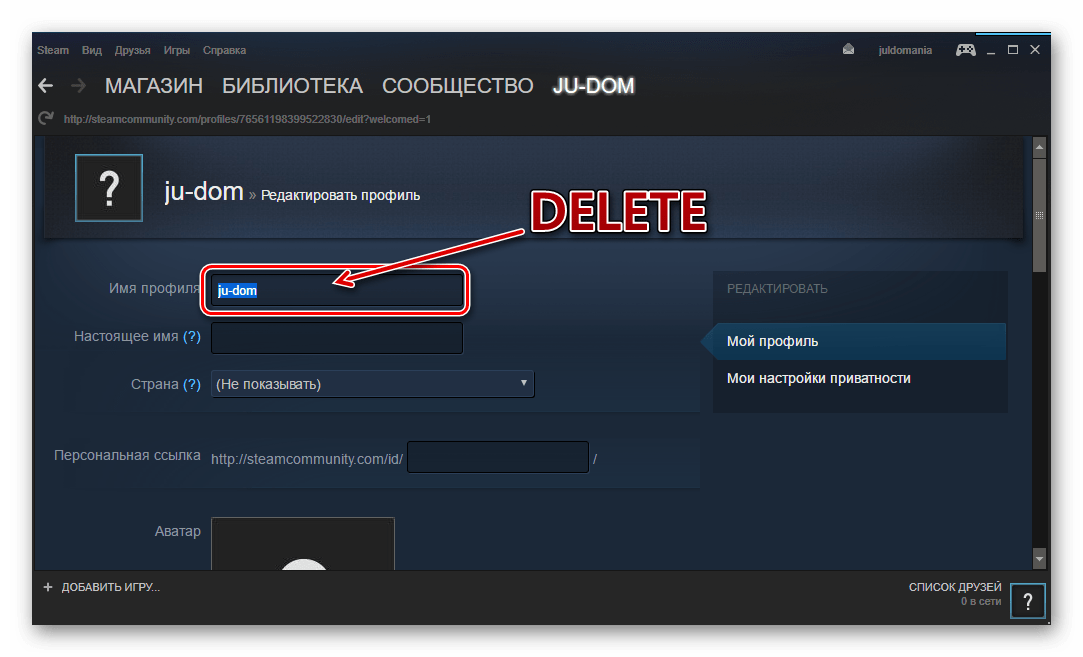 О том, как зайти в раздел редактирования настроек профиля, где и предоставляется возможность изменения ника, мы написали выше. Теперь же вам просто остается очистить это поле и выполнить следующее: