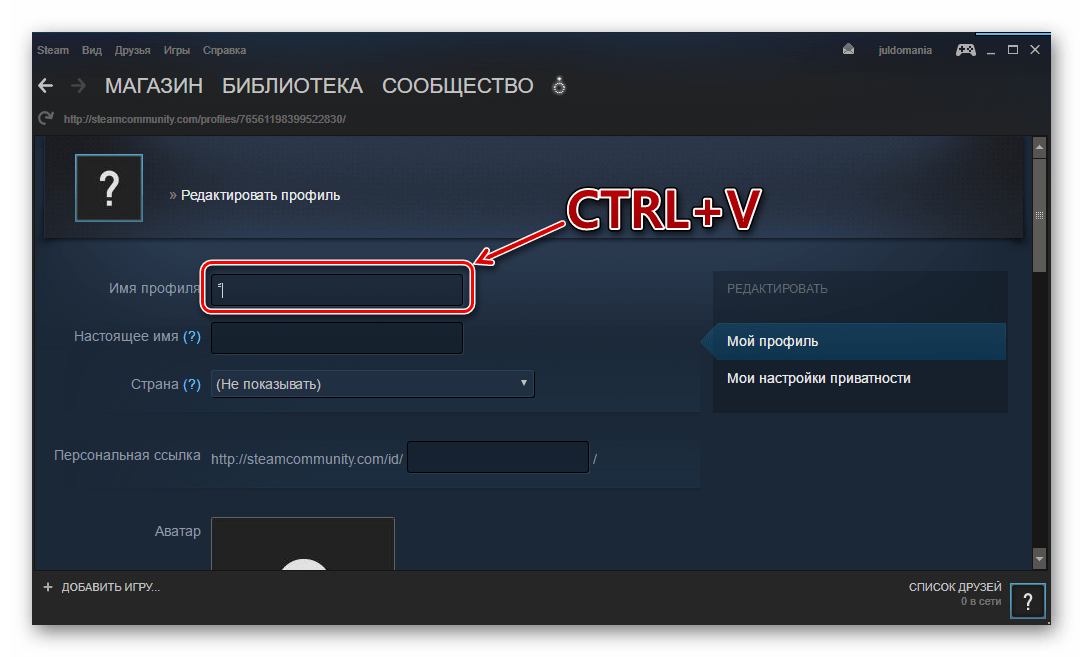 Заходим в настройки профиля Steam и вводим в ник один из символов на выбор: