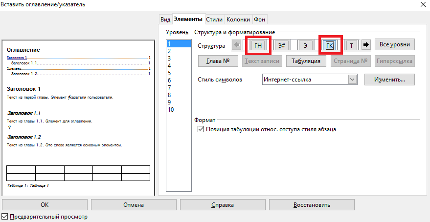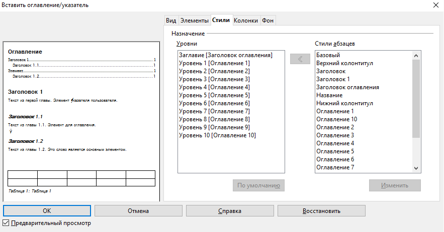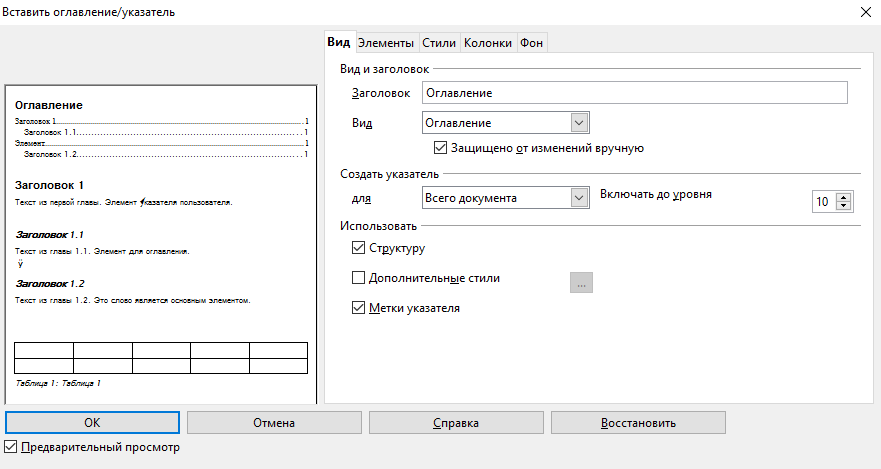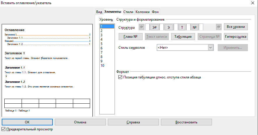 Во Writer’е нету заранее готовых шаблонов для оформления оглавлений и указателей. Однако, он очень гибок и позволяет настраивать их внешний вид «от и до» — как душа пожелает. Большая часть настроек доступна через либо через пункт в контекстном меню, вызываемом щелчком правой кнопкой мыши по оглавлению или указателю. Вкладки и определяют общий вид структуры, но наиболее важные настройки форматирования находятся на вкладке .