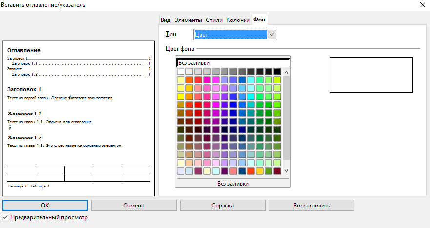 Также можно указать фоновый цвет оглавления. Делается это на вкладке Фон