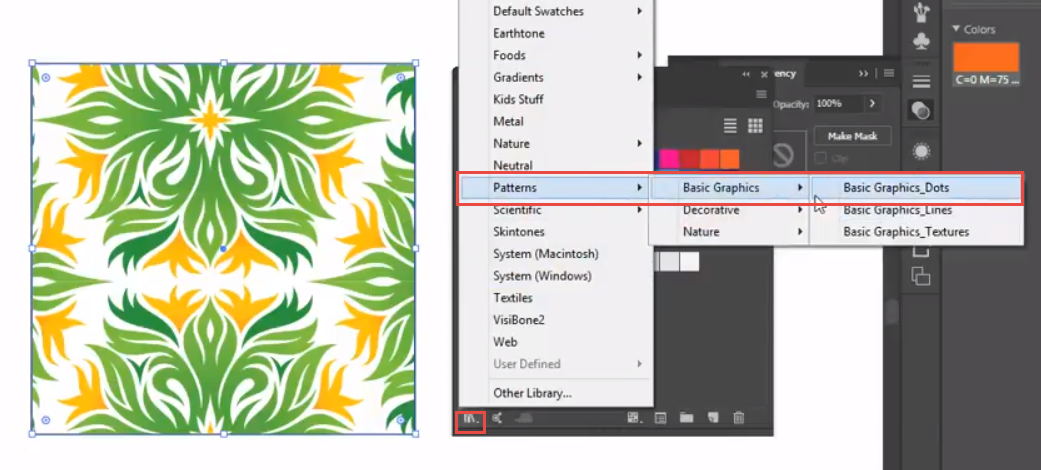 Создайте прямоугольник того же размера, что и новый артборд.Используя панель «Образцы» на правой панели инструментов, примените узор, заполнив прямоугольник , щелкнув значок самого узора.
