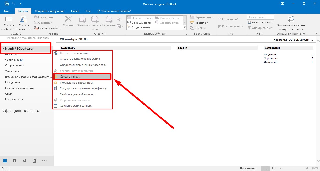 У произведённого только что действия есть одно неудобное следствие: вновь сохранённого шаблона из интерфейса программы видно не будет. «Обмануть» это неудобство можно созданием папки для хранения шаблонов средствами самого Outlook-а. Попробуйте поступить вот так: правым щелчком мыши на имени вашего почтового ящика в главном окне программы инициируем открытие контекстного меню. В нём выбираем команду «Создать папку».