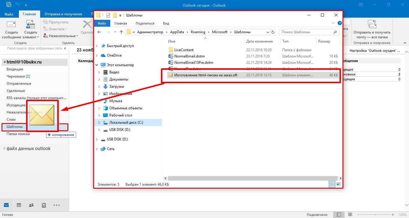 Назовём эту папку наглядно: «Шаблоны». И затем, обычным перетаскиванием файла прямо из окна «Проводника», скопируем в неё файл шаблона, содержащий наше html-письмо.
